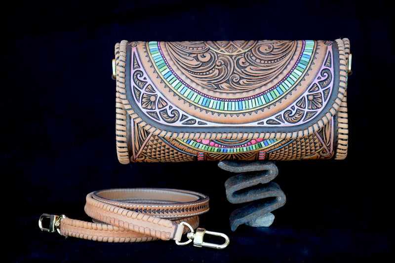 The leather lacing was hand cut from the same leather as the rest of the purse and will darken and age, acquiring a similarly beautiful patina. Subtly painted details and intricate geometric stamping are balanced by flourishes of delicate scrolls.